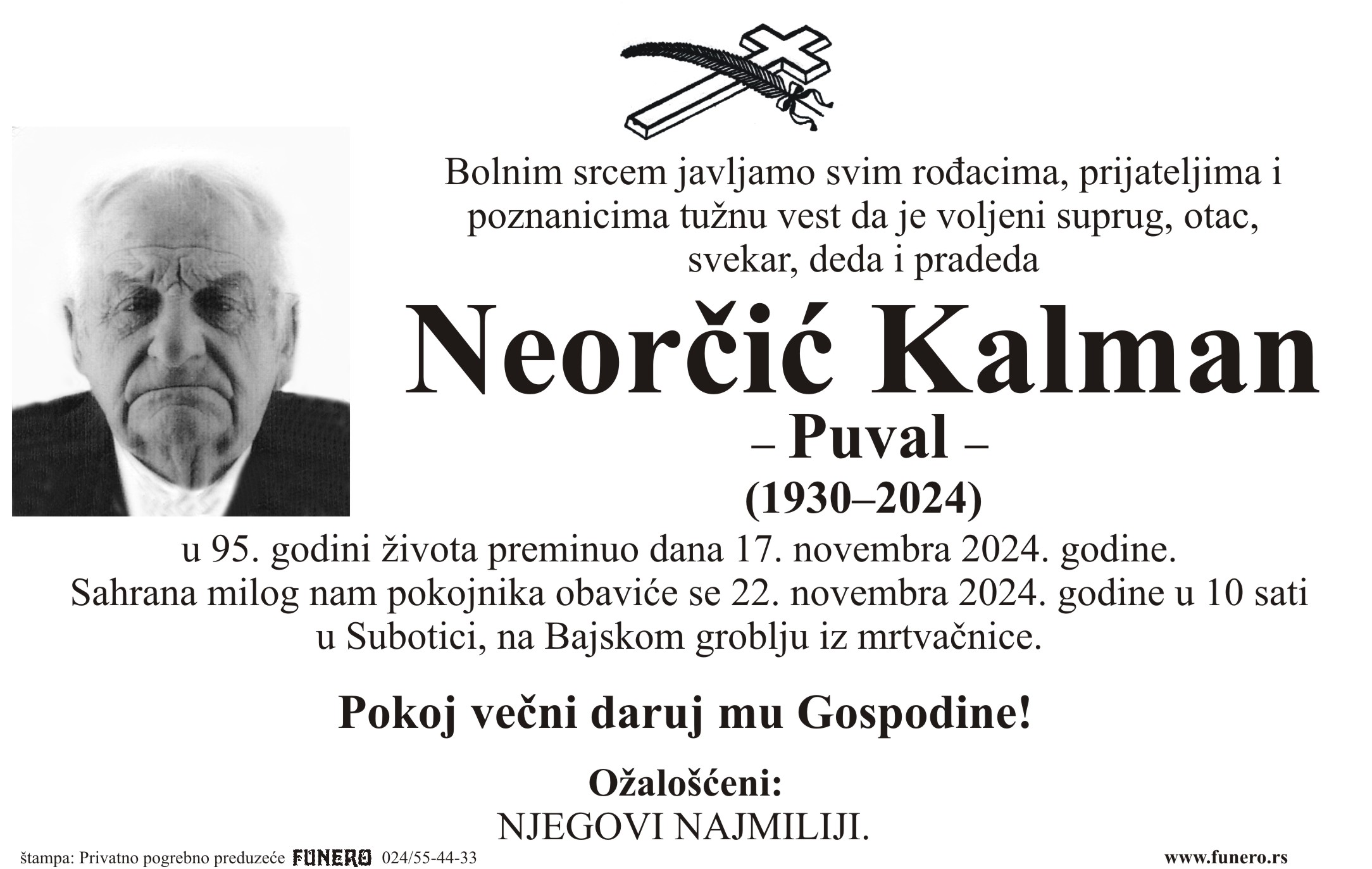U 94. godini preminuo je Kalman Neorčić iz Subotice, iz ulice Geze Saboa. Sahrana je 22. novembra u 10 sati na Bajskom groblju iz mrtvačnice.