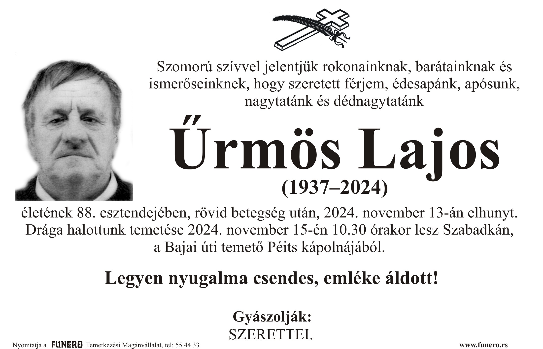 U 87. godini preminuo je Lajoš Irmeš iz Kelebije, iz ulice Otmara Majera. Sahrana je 15. novembra u 10 sati i 30 minuta na Bajskom groblju iz Peić kapele.