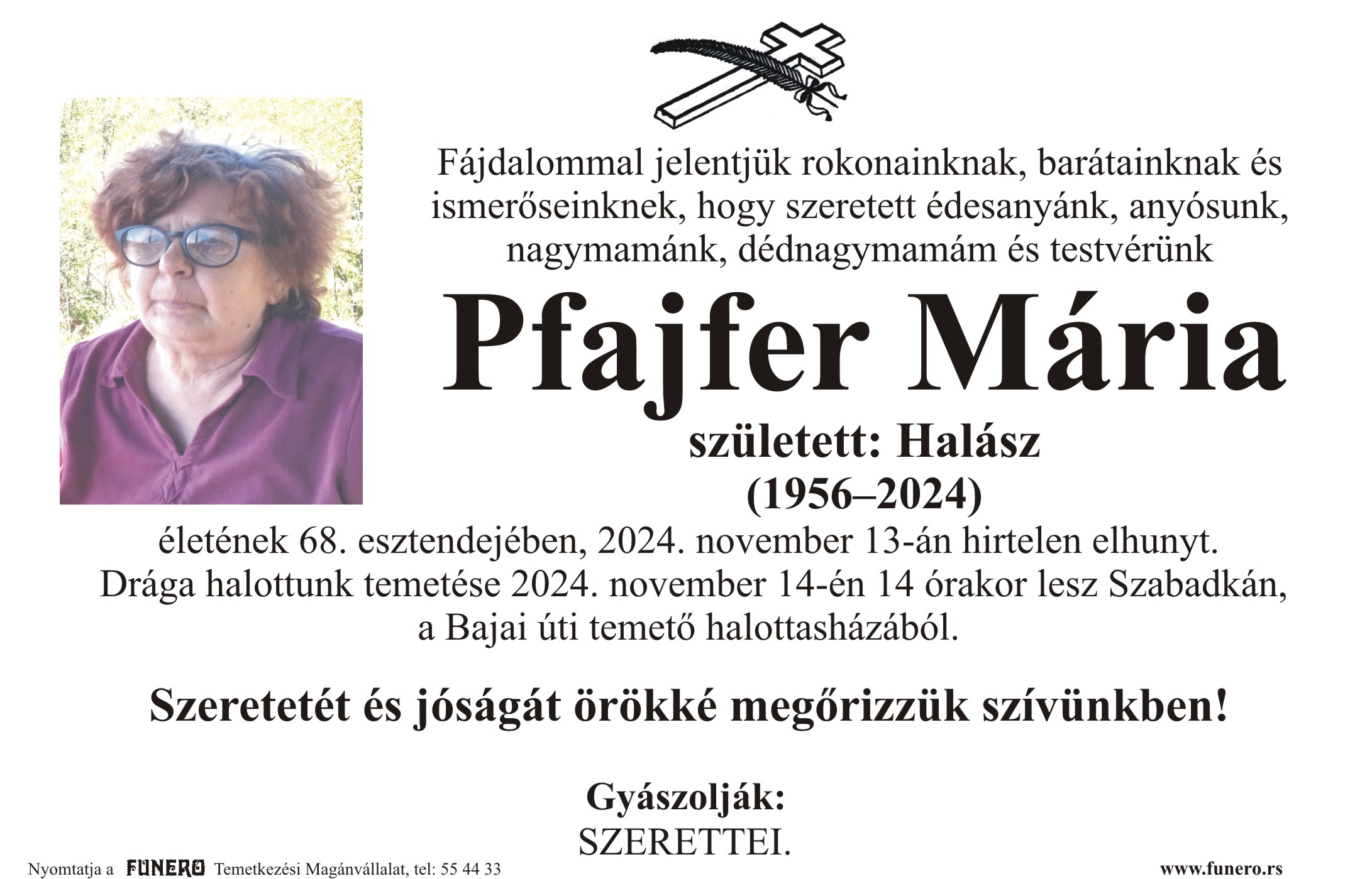 U 68. godini preminula je Maria Pfajfer iz Subotice, iz ulice 15. Aprila. Sahrana je 14. novembra u 14 sati na Bajskom groblju iz mrtvačnice.