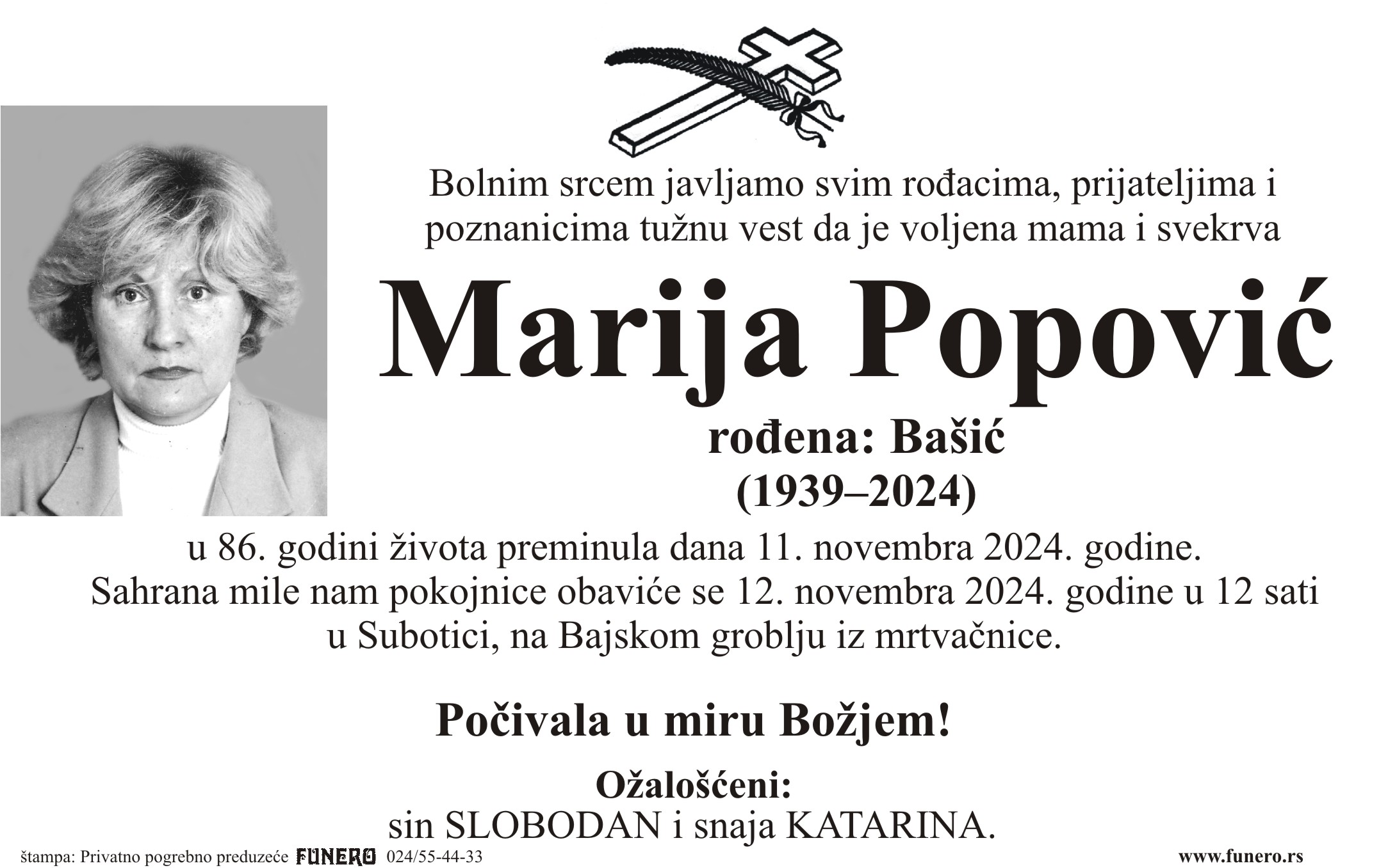U 85. godini preminula je Marija Popović iz Subotice, iz ulice 51. Divizije. Sahrana je 12. novembra u 12 sati na Bajskom groblju iz mrtvačnice.