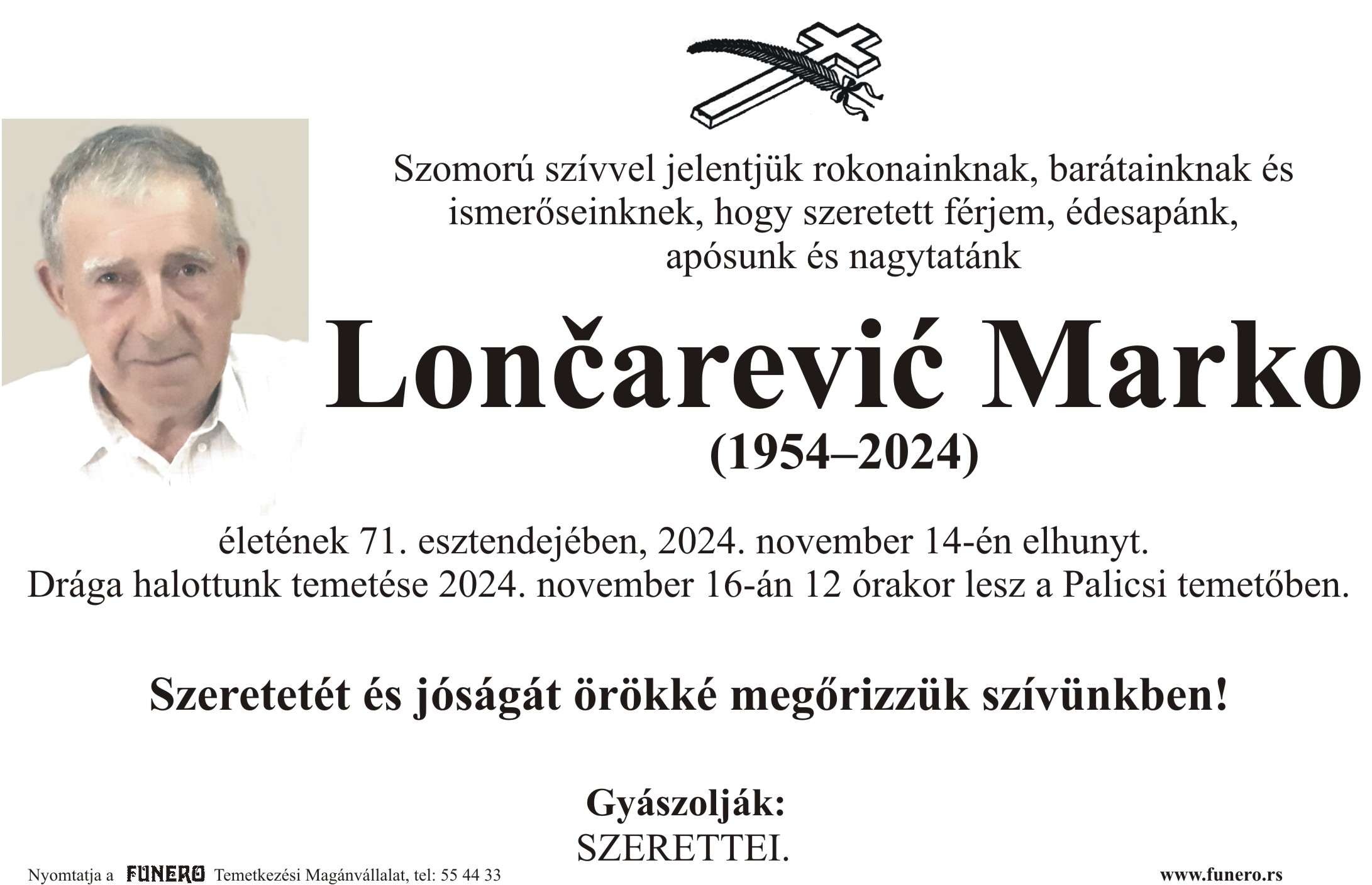 U 70. godini preminuo je Marko Lončarević iz Hajdukova. Sahrana je 16. novembra u 12 sati na Palićkom groblju.