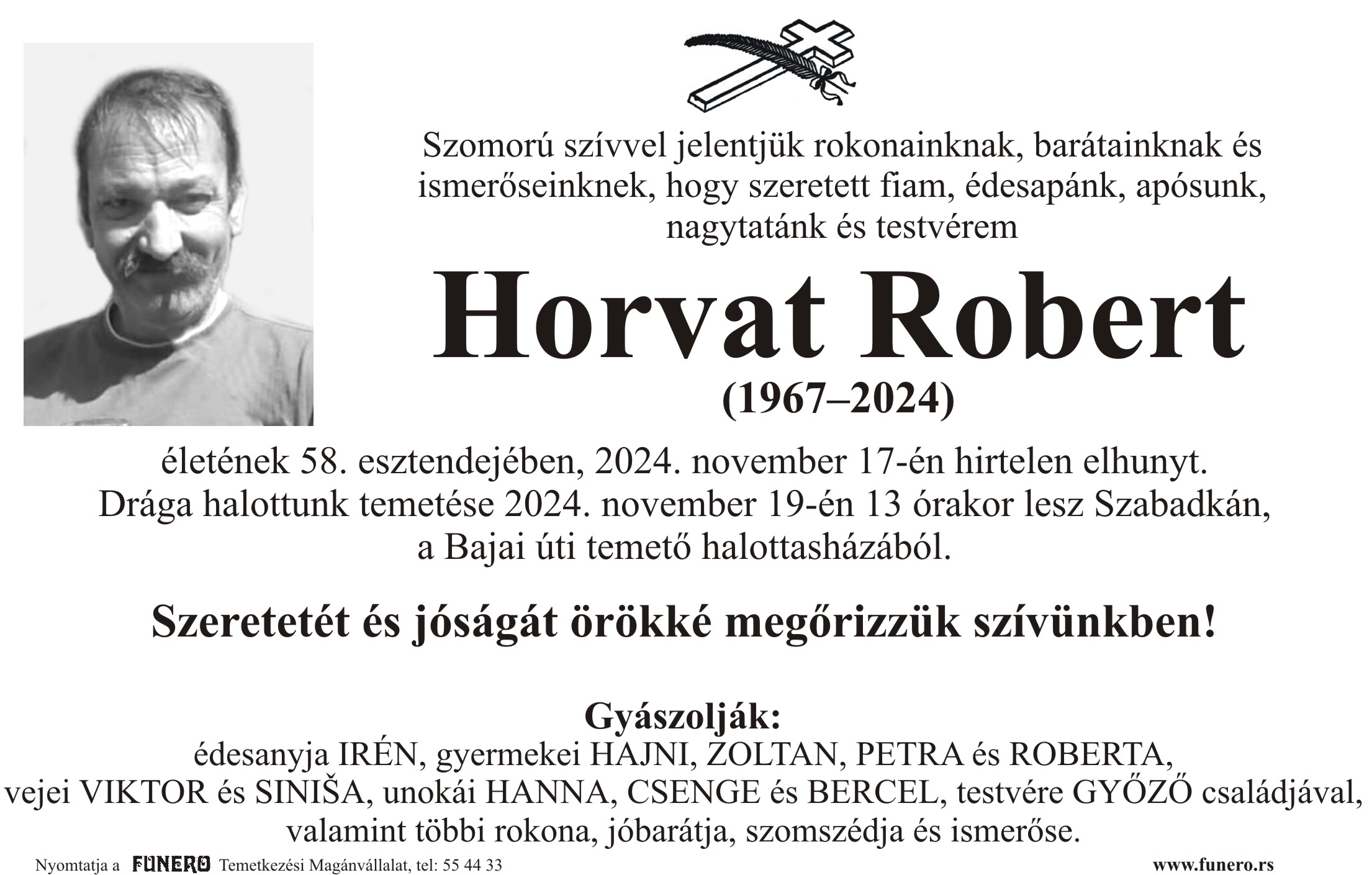 U 57. godini preminuo je Robert Horvat iz Subotice, iz Uskočke ulice. Sahrana je 19. novembra u 13 sati na Bajskom groblju iz mrtvačnice.