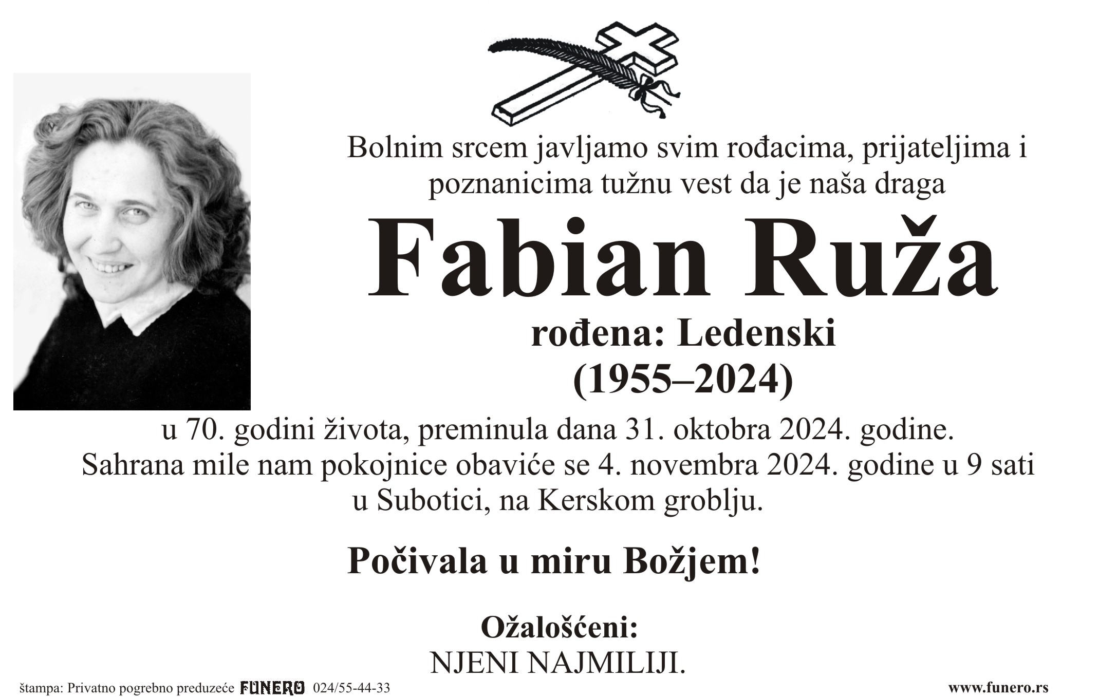 U 69. godini preminula je Ruža Fabian iz Subotice, iz Hvarske ulice. Sahrana je 4. novembra u 9 sati na Kerskom groblju.
