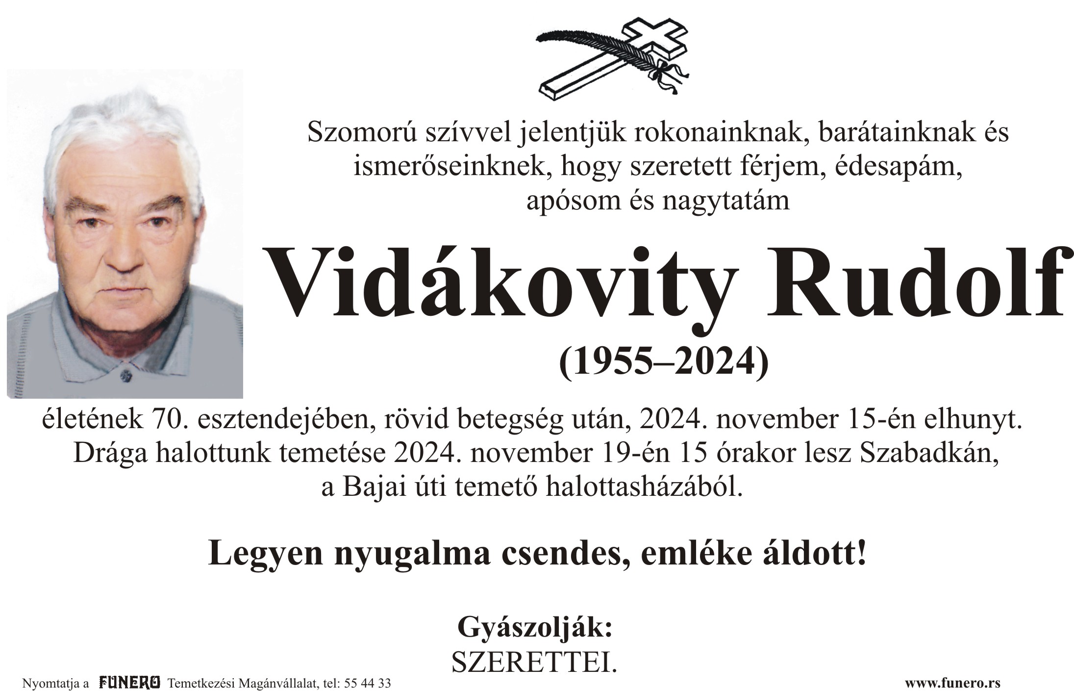U 69. godini preminuo je Rudolf Vidaković iz Subotice, iz ulice Lajoša Joa. Sahrana je 19. novembra u 15 sati na Bajskom groblju iz mrtvačnice.