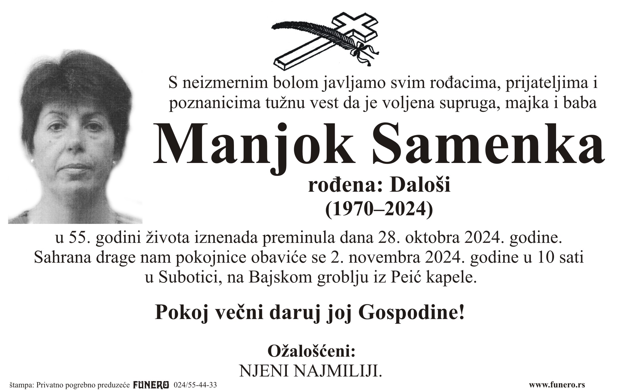 U 54. godini preminula je Samenka Manjok iz Novog Sada. Sahrana je 2. novembra u 10 sati na Bajskom groblju iz Peić kapele.
