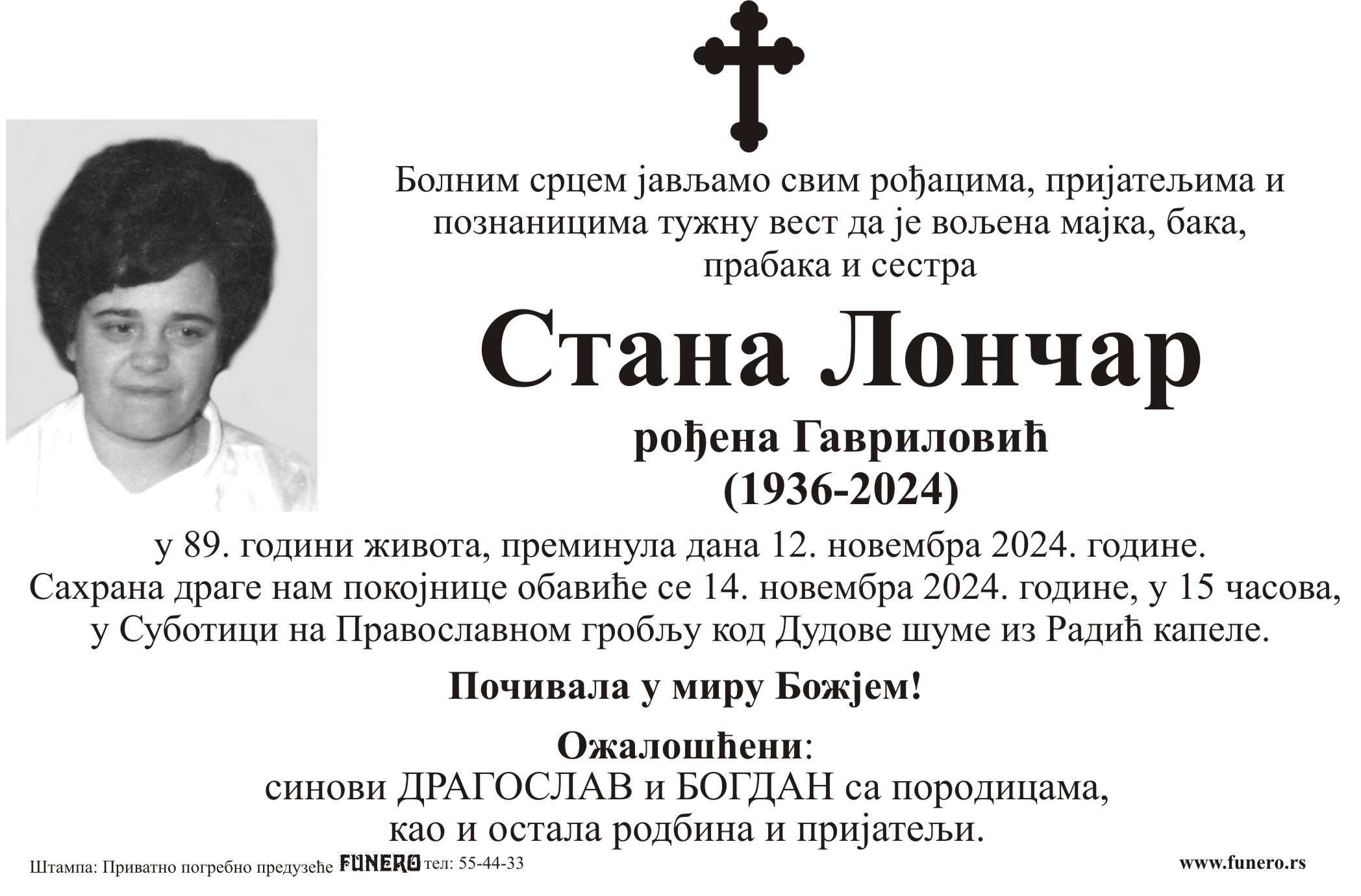 U 88. godini preminula je Stana Lončar iz Subotice, iz Mačvanske ulice. Sahrana je 14. novembra u 15 časova na Pravoslavnom groblju kod Dudove šume iz Radić kapele.