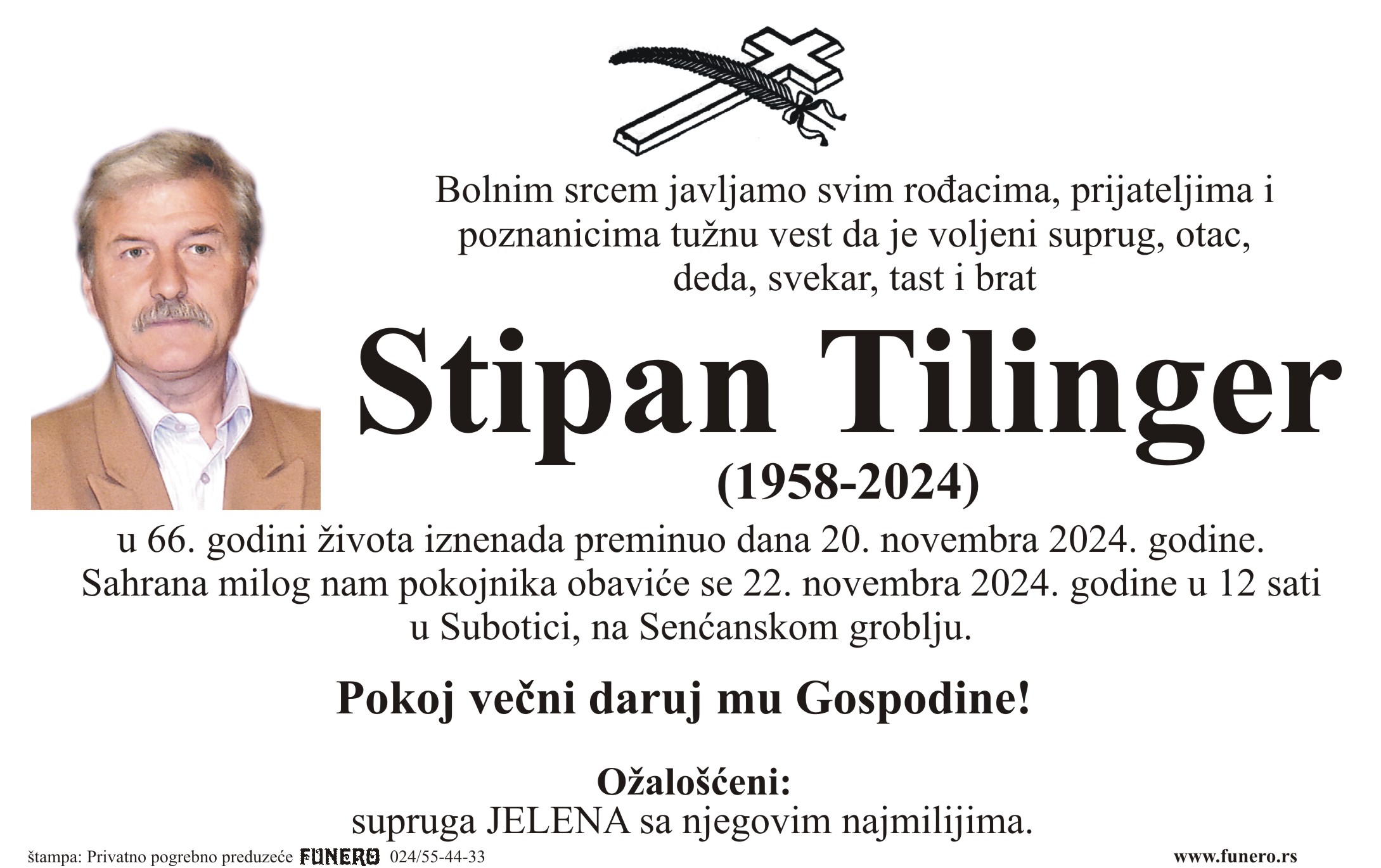 U 66. godini preminuo je Stipan Tilinger iz Subotice, iz Jablaničke ulice. Sahrana je 22. novembra u 12 sati na Senćanskom groblju.