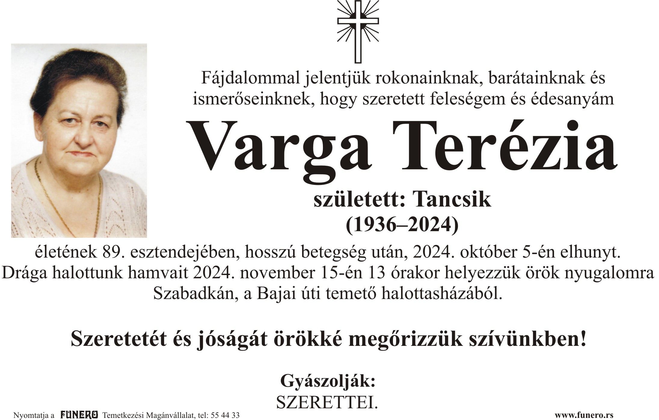 U 88. godini preminula je Terezija Varga iz Subotice. Polaganje urne je 15. novembra u 13 sati na Bajskom groblju iz mrtvačnice.
