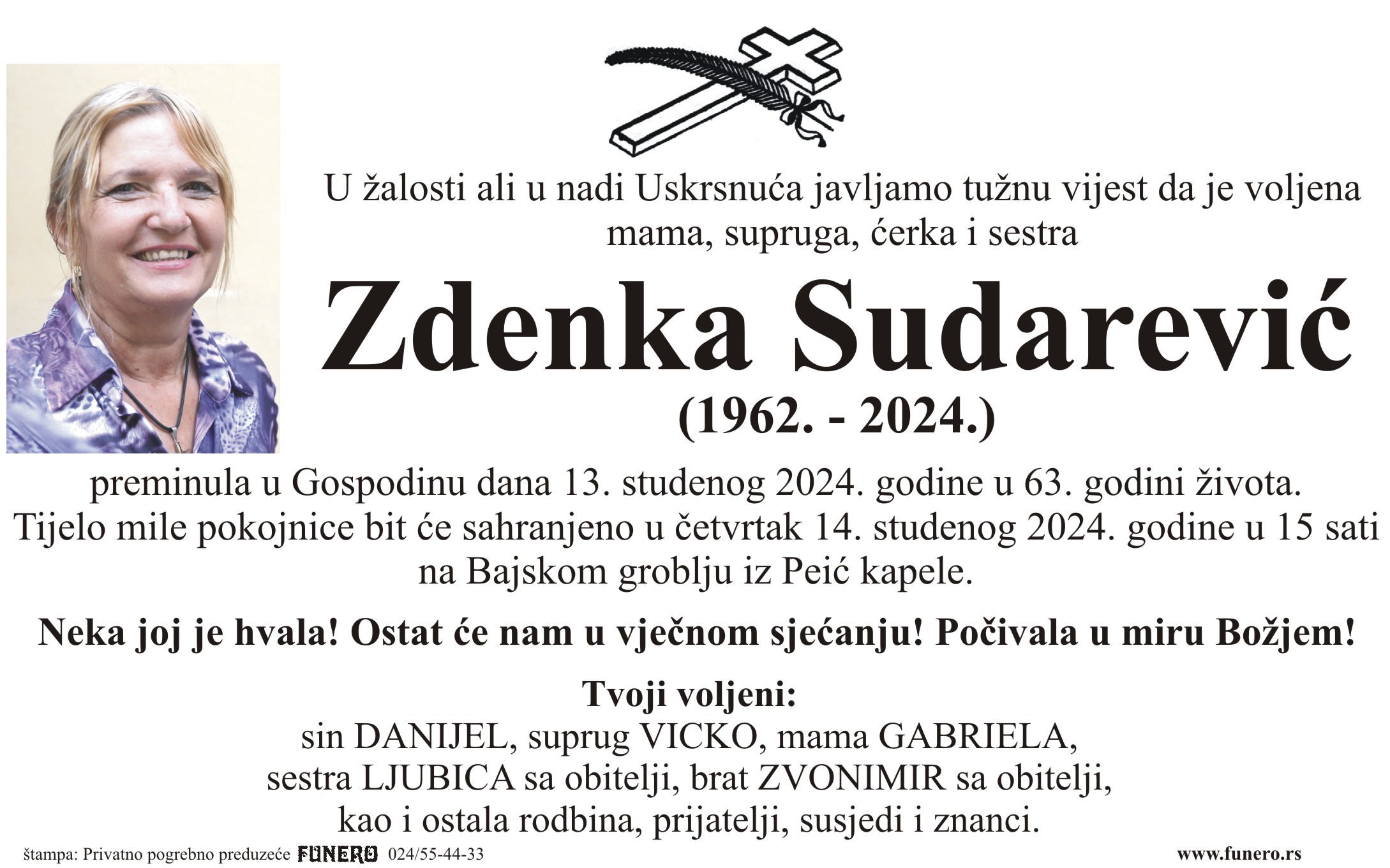 U 62. godini preminula je Zdenka Sudarević iz Subotice, iz ulice Ivana Gorana Kovačića. Sahrana je 14. novembra u 15 sati na Bajskom groblju iz Peić kapele.