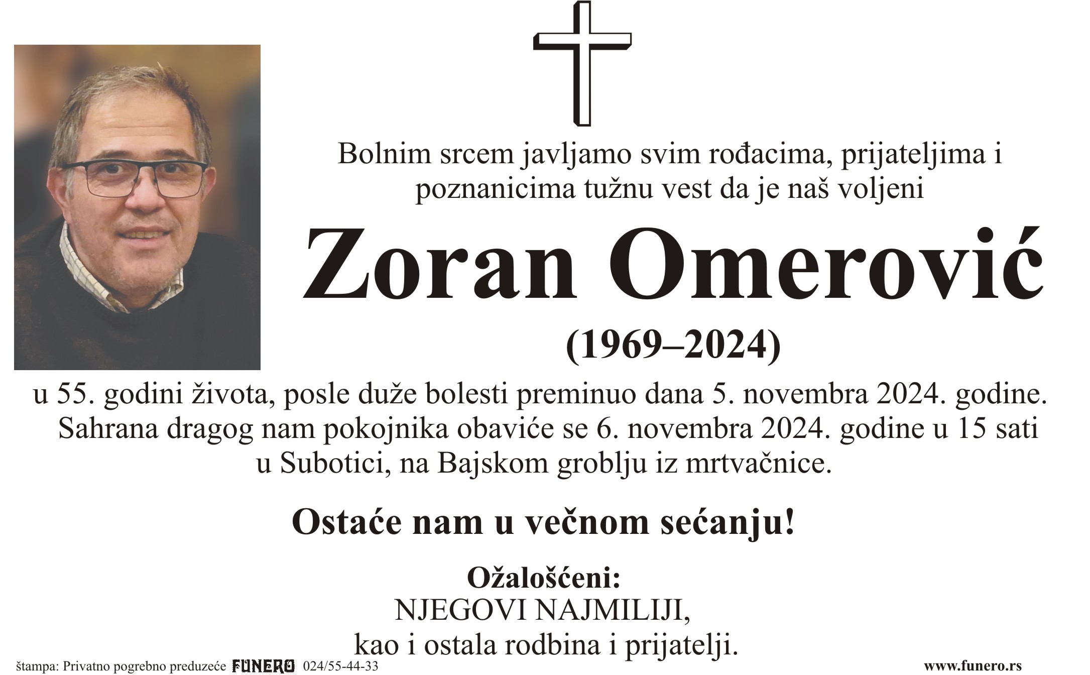U 55. godini preminuo je Zoran Omerović iz Subotice, iz ulice Bore Stankovića. Sahrana je 6. novembra u 15 sati na Bajskom groblju iz mrtvačnice.