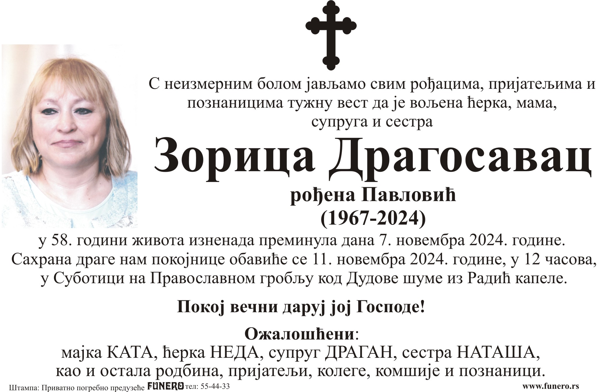 U 57. godini preminula je Zorica Dragosavac iz Subotice, iz ulice Partizanskih baza. Sahrana je 11. novembra u 12 časova na Pravoslavnom groblju kod Dudove šume iz Radić kapele.