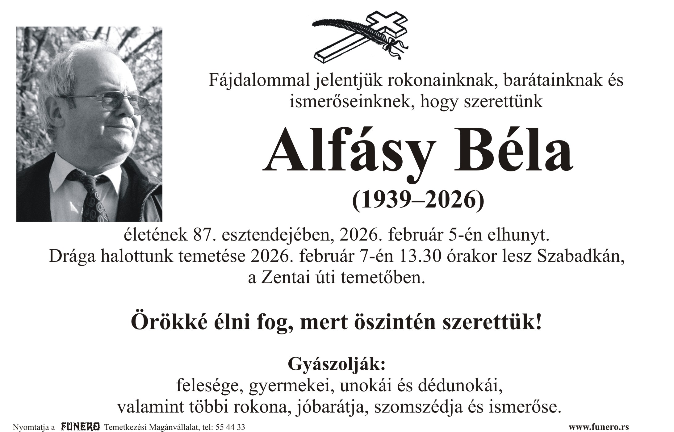 U 87. godini preminuo je Bela Alfaši iz Subotice, iz Šenoine ulice. Sahrana je 7. februara u 13 sati i 30 minuta na Senćanskom groblju.
