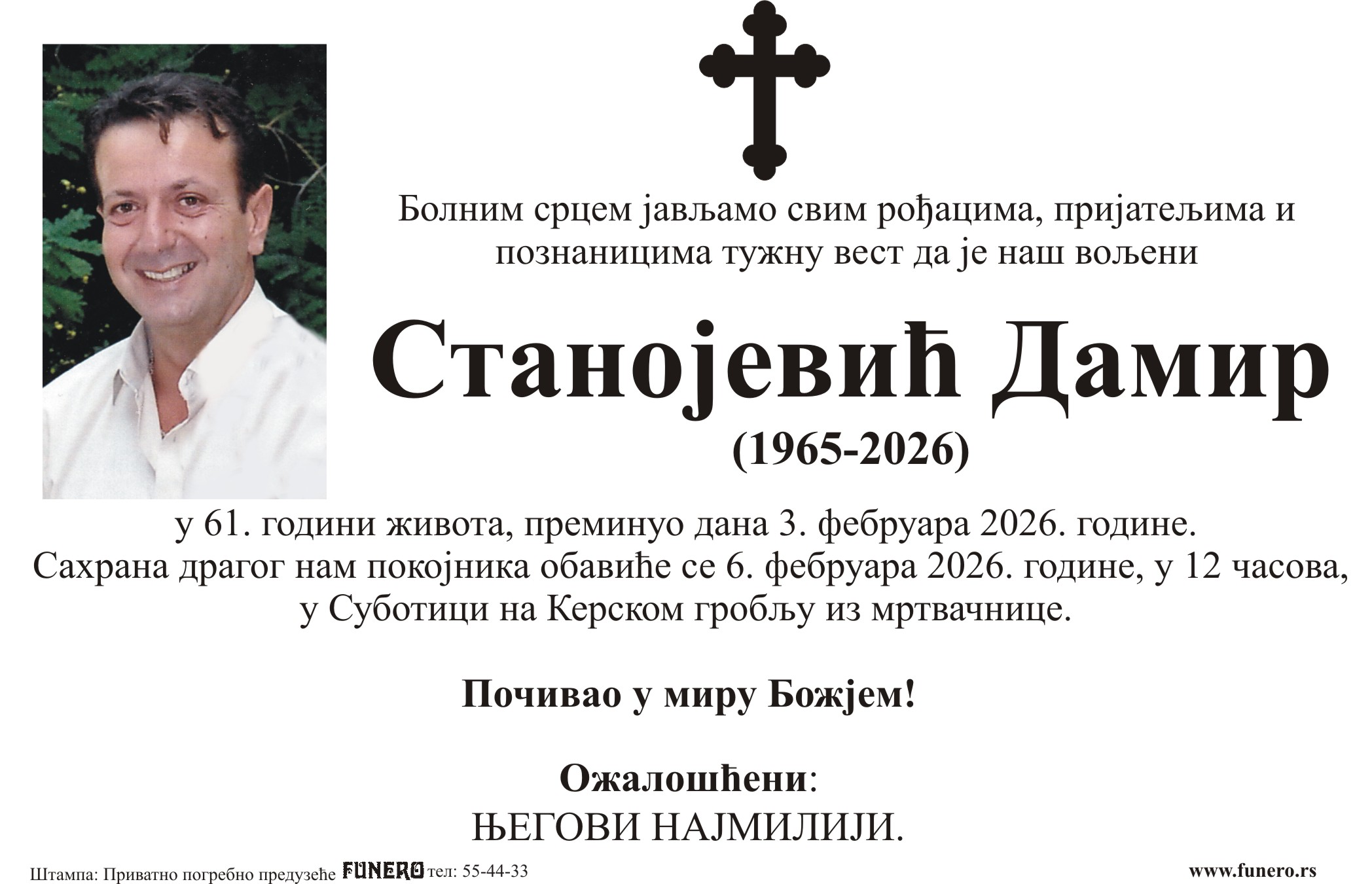 U 61. godini preminuo je Damir Stanojević iz Subotice, iz ulice Jovana Cvijića. Sahrana je 6. februara u 12 časova na Kerskom groblju iz mrtvačnice.