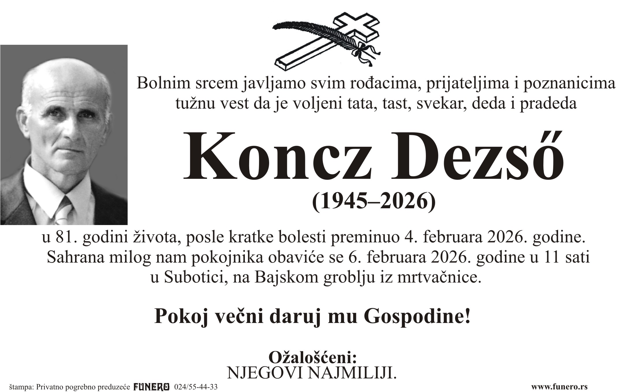 U 81. godini preminuo je Deže Konc iz Male Bosne. Sahrana je 6. februara u 11 sati na Bajskom groblju iz mrtvačnice.