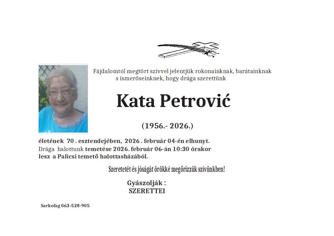 U 84. godini preminula je Piroška Matković sa Palića, iz Parka fizičke kulture. Sahrana je 29. januara u 13 sati i 30 minuta na Palićkom groblju.