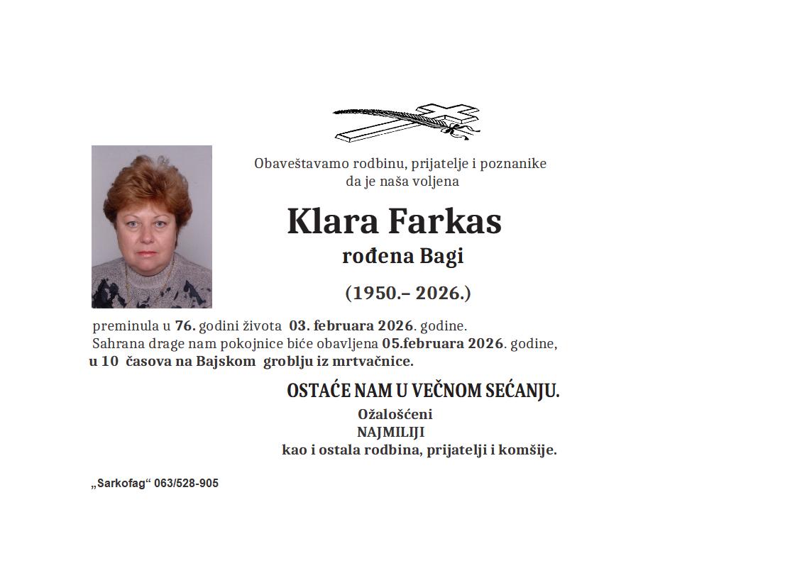 preminula u 76. godini života 03. februara 2026. godine.Sahrana drage nam pokojnice biće obavljena 05.februara 2026. godine, u 10 casova na Bajskom groblju iz mrtvačnice.OSTAĆE NAM U VEČNOM SEĆANJU.OžalošćeniNAJMILI kao i ostala rodbina, prijatelji i komšije.