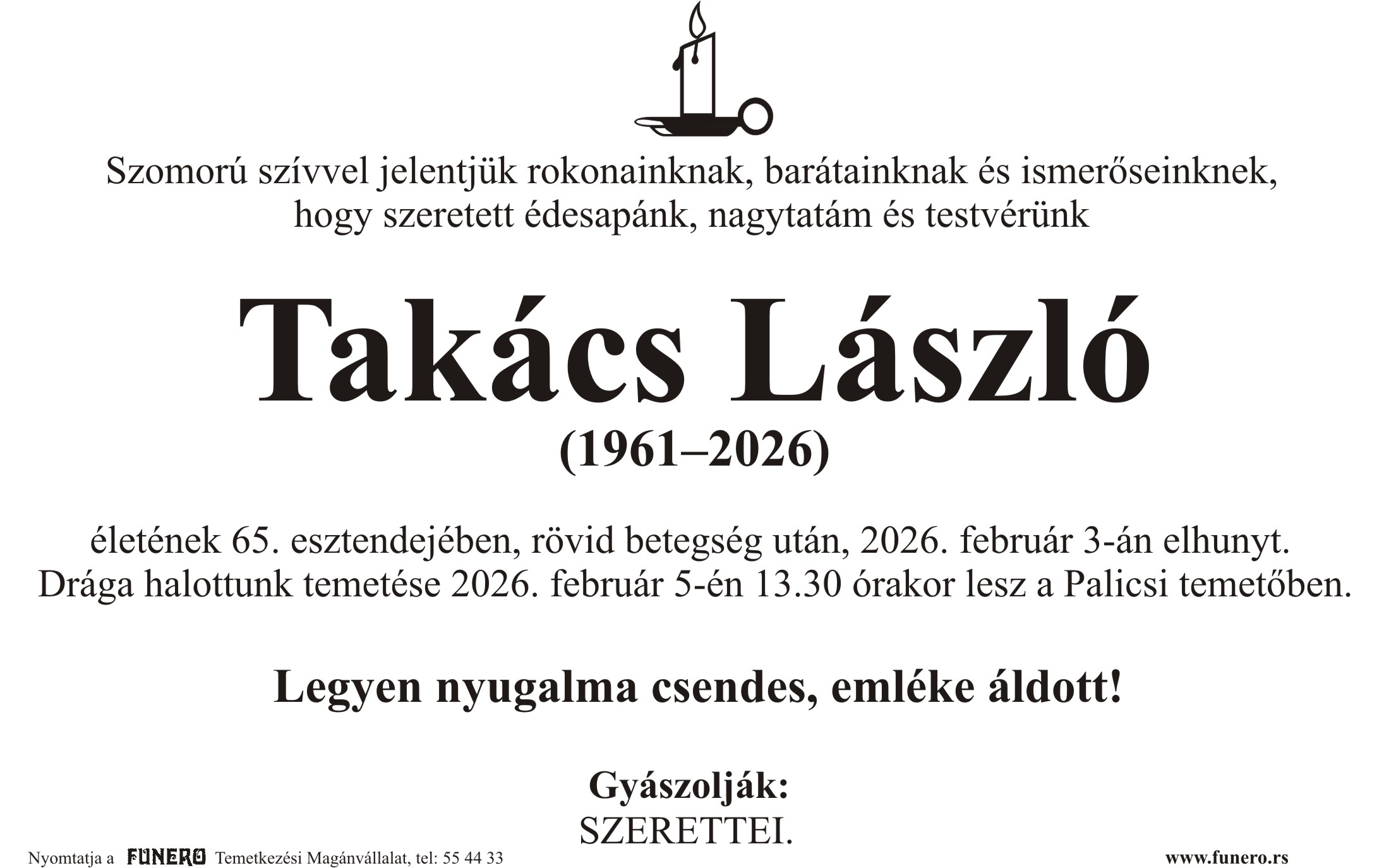 U 65. godini preminuo je Laslo Takač iz Subotice, iz ulice Tuk Ugarnice. Sahrana je 5. februara u 13 sati i 30 minuta na Palićkom groblju.