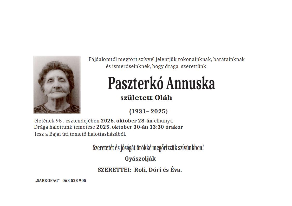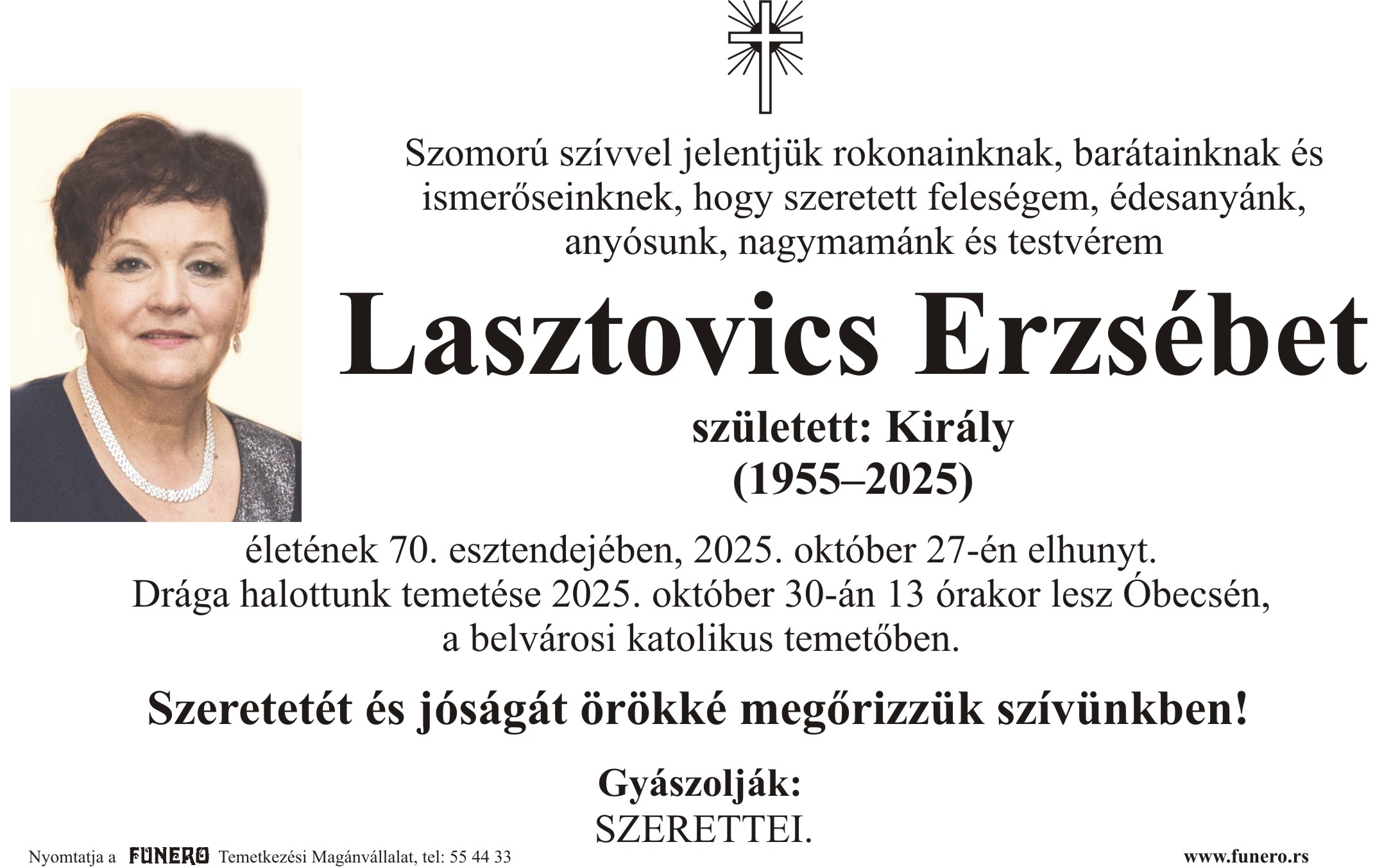 U 70. godini preminula je Eržebet Lastovič iz Bečeja, iz ulice Svetozara Čelanića. Sahrana je 30. oktobra u 13 sati na Centralnom Katoličkom groblju u Bečeju