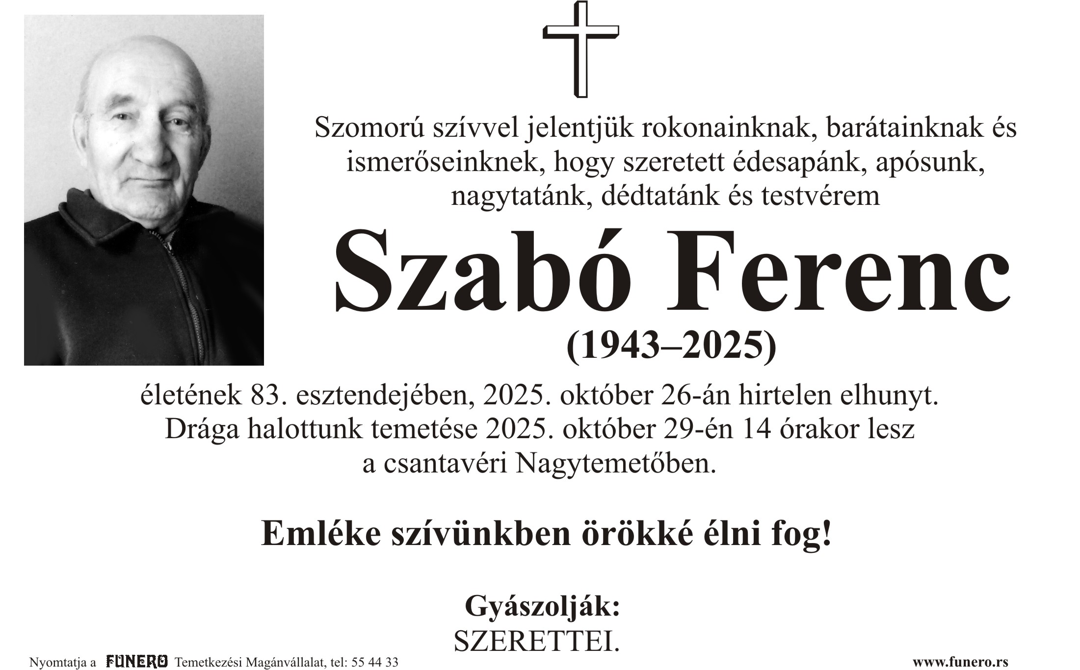 U 82. godini preminuo je Ferenc Sabo iz Čantavira. Sahrana je 29. oktobra u 14 sati na Velikom groblju u Čantaviru.