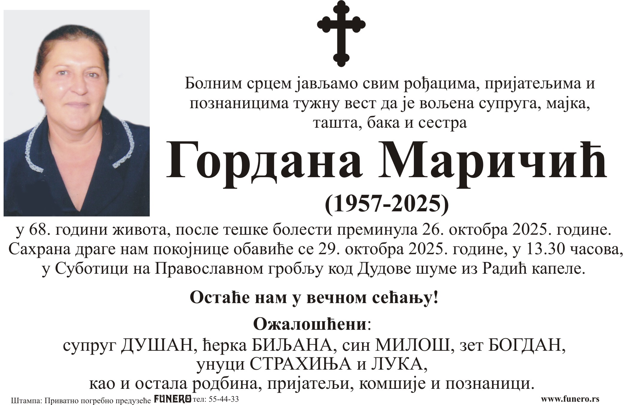 U 68. godini preminula je Gordana Maričić iz Subotice, iz Jadranske ulice. Sahrana je 29. oktobra u 13 časova i 30 minuta na Pravoslavnom groblju kod Dudove šume iz Radić kapele.
