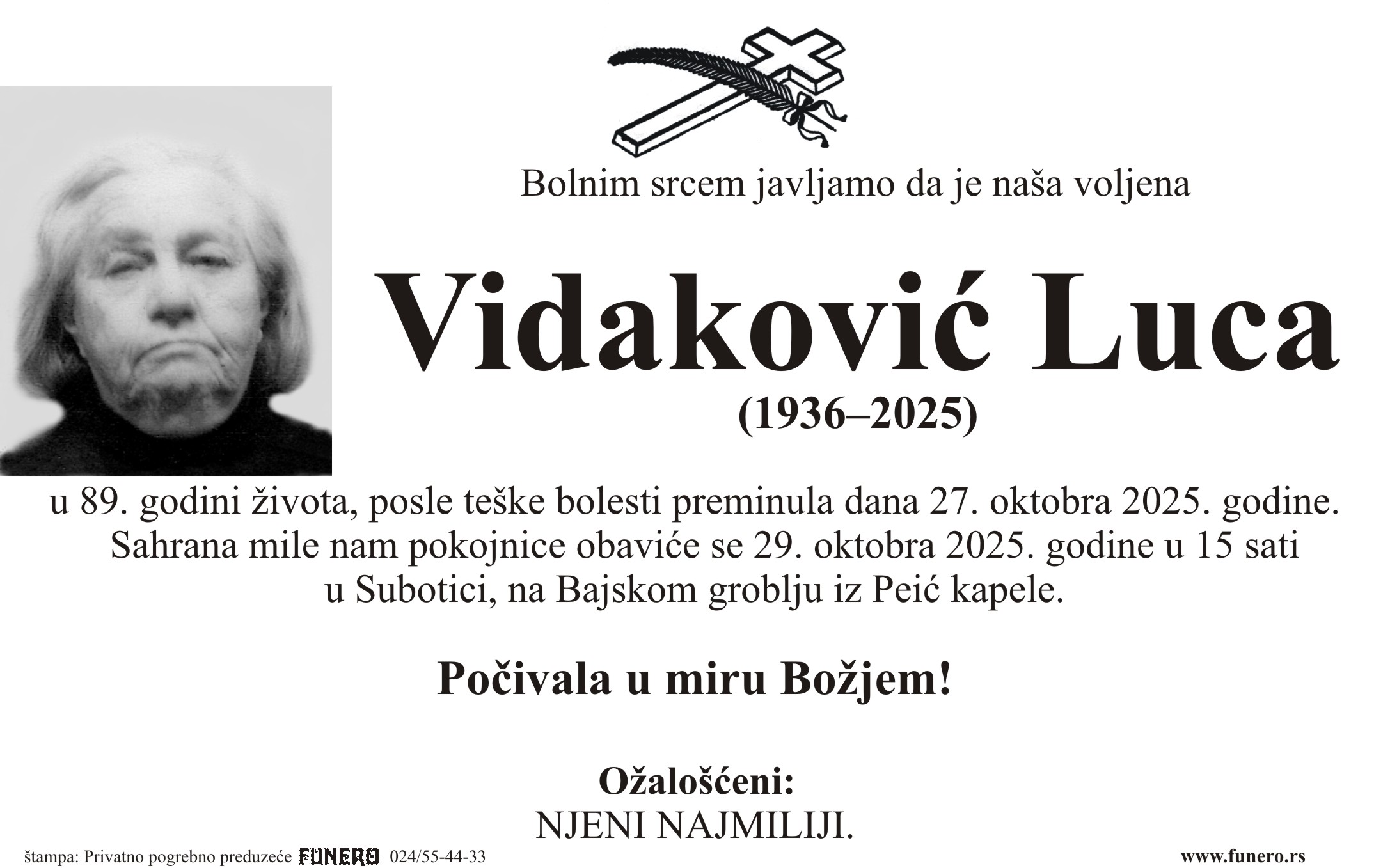 U 89. godini preminula je Luca Vidaković iz Male Bosne. Sahrana je 29. oktobra u 15 sati na Bajskom groblju iz Peić kapele.