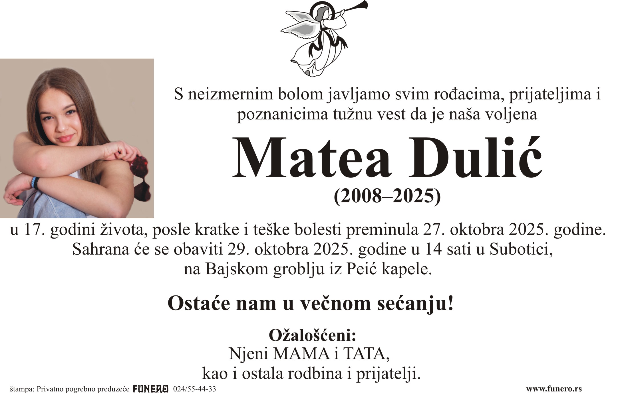 U 17. godini preminula je Matea Dulić iz Subotice. Sahrana je 29. oktobra u 14 sati na Bajskom groblju iz Peić kapele.