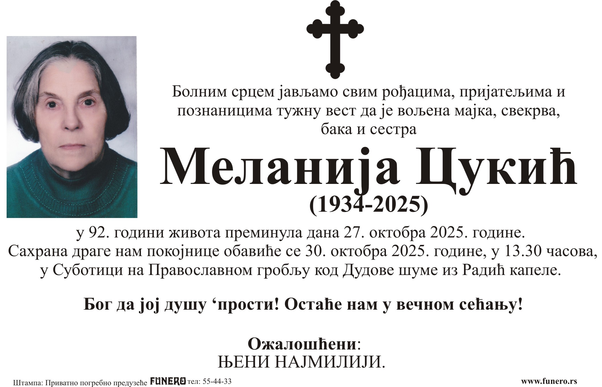 U 91. godini preminula je Melanija Cukić iz Subotice, iz ulice Braće Radića. Sahrana je 30. oktobra u 13 časova i 30 minuta na Pravoslavnom groblju kod Dudove šume iz Radić kapele.
