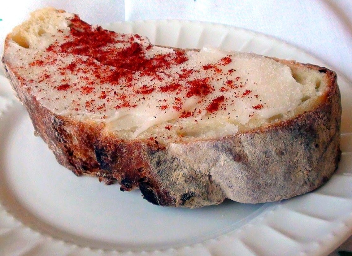 Sastojci: parče hleba, svinjska mast, mlevena crvena paprika, so.