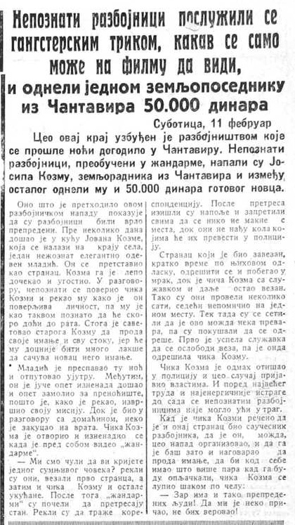 U februaru 1939. desilo se razbojništvo u Čanatviru. U kuću Kozma Jovana/Janoša došao je mladi čovek stranac, a domaćin ga je ugostio. Ubrzo su na vrata zakucali, ispostaviće se lažni žandari, vezali ukućane i “gosta” te uzeli 50. 000 dinara.