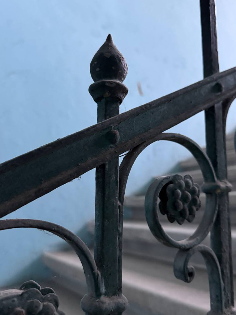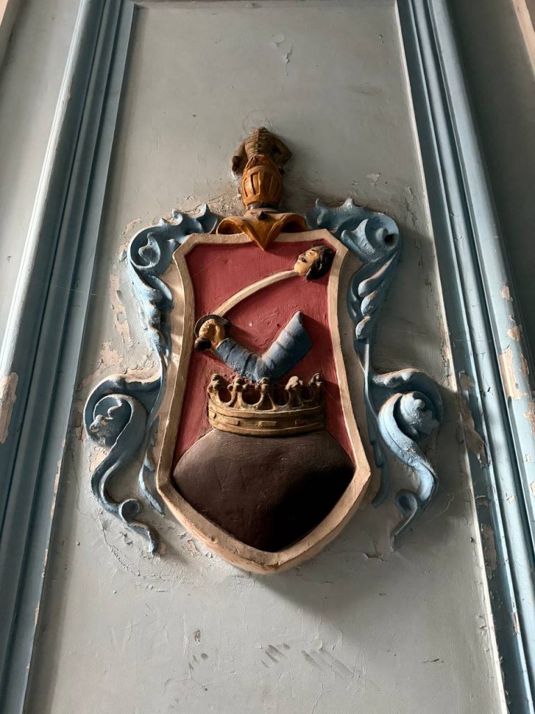 Centralni balkon izrađen je od kovanog gvožđa, a iznad balkonskih vrata nalazi se plemićki grb porodice Jo od Sentivana. Isti grb u boji može se videti i unutar suvog ulaza.