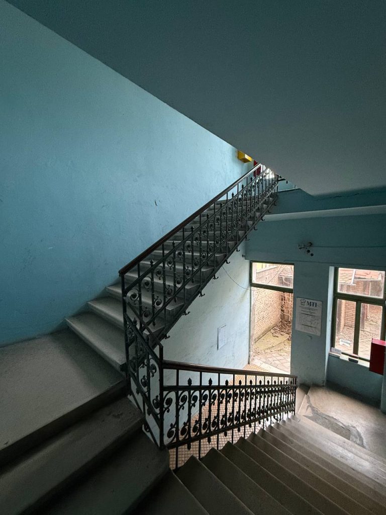 Zbog nedostatka prostora, glavno stepenište nije moglo biti smešteno u uličnom delu zgrade, već je planirano na spoju uličnog trakta i dvorišnog krila. Međutim, kuća nije u potpunosti izvedena prema projektu — ulaz je napravljen mnogo uži, a stepenište je ipak postavljeno unutar glavnog dela zgrade, uz sam ulaz.