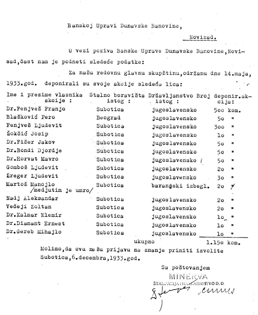 Porodica Fenjveš bila je ključna za razvoj štamparije. Franjo Fenjveš i njegov brat Lajčo, urednik lista Napló, imali su najveći broj deonica. Iako je štamparija bila uspešna, 1926. godine suočila se s finansijskom krizom, a konkurenti su sugerisali da je spašena finansiranjem iz Budimpešte. Bez obzira na poteškoće, Minerva je opstala i nastavila da raste.