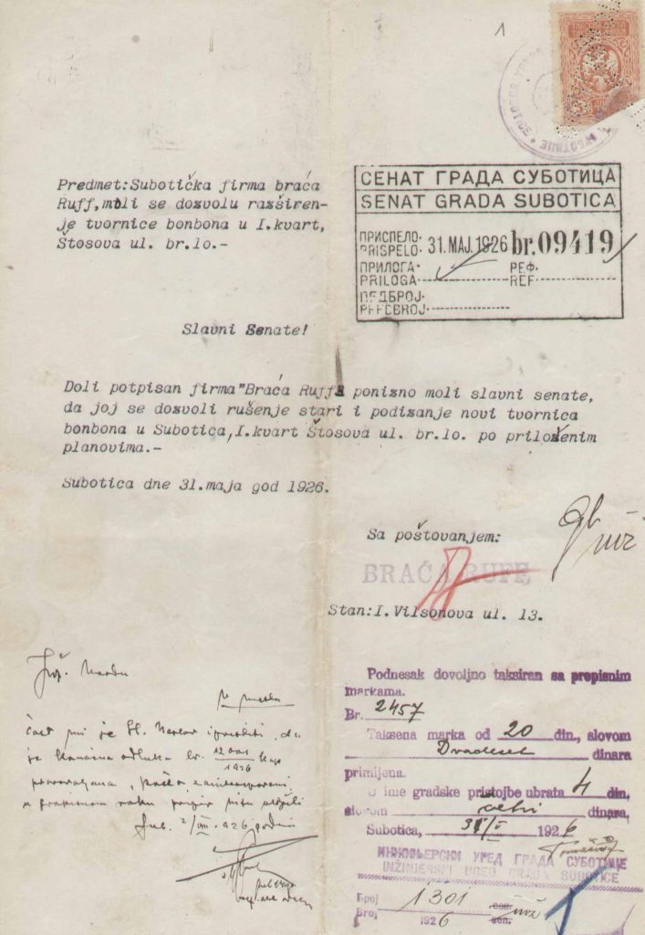 Subotička firma “Braća Ruff” obratila se 31.5.1926. gradskim vlastima sa molbom da dobiju dozvolu za rušenje stari i podizanje novi tvornica bonbona na adresi Štosova 10. No, kako se vidi iz nastavka prepiske i prilozima, reč je bila samo o kotlarnici, a ne čitavom pogonu nove fabrike.
