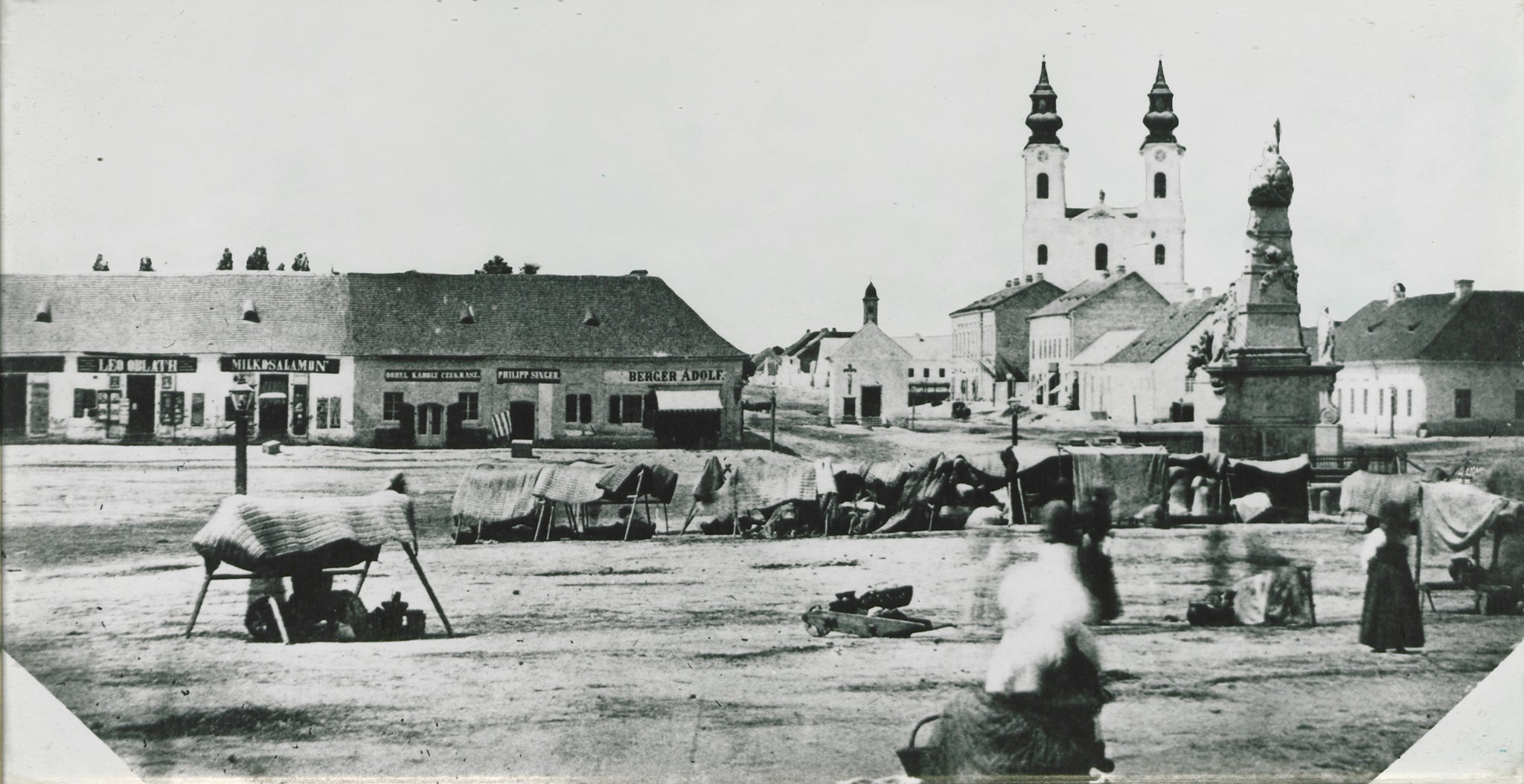 Na fotografiji se takođe jasno vidi spomenik Svetom Trojstvu, koji se i danas nalazi na istom mestu, simbolizujući kontinuitet i bogatu tradiciju Subotice. Ova slika pruža dragocen uvid u izgled trgova i svakodnevni život grada iz tog vremena, kada su pijace i spomenici činili nerazdvojni deo urbanog pejzaža.