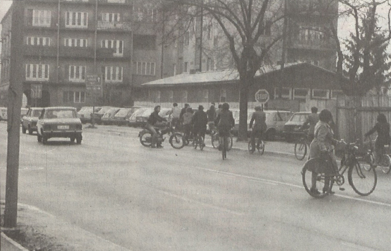 Na slici vidimo grupu biciklista kako lagano prelaze prometnicu. Simbolika ove slike leži u jednostavnosti i održivom načinu života koji je nekada bio svakodnevica. Bicikl nije bio samo prevozno sredstvo, već i simbol slobode, društvenosti i povezanosti sa okolinom.