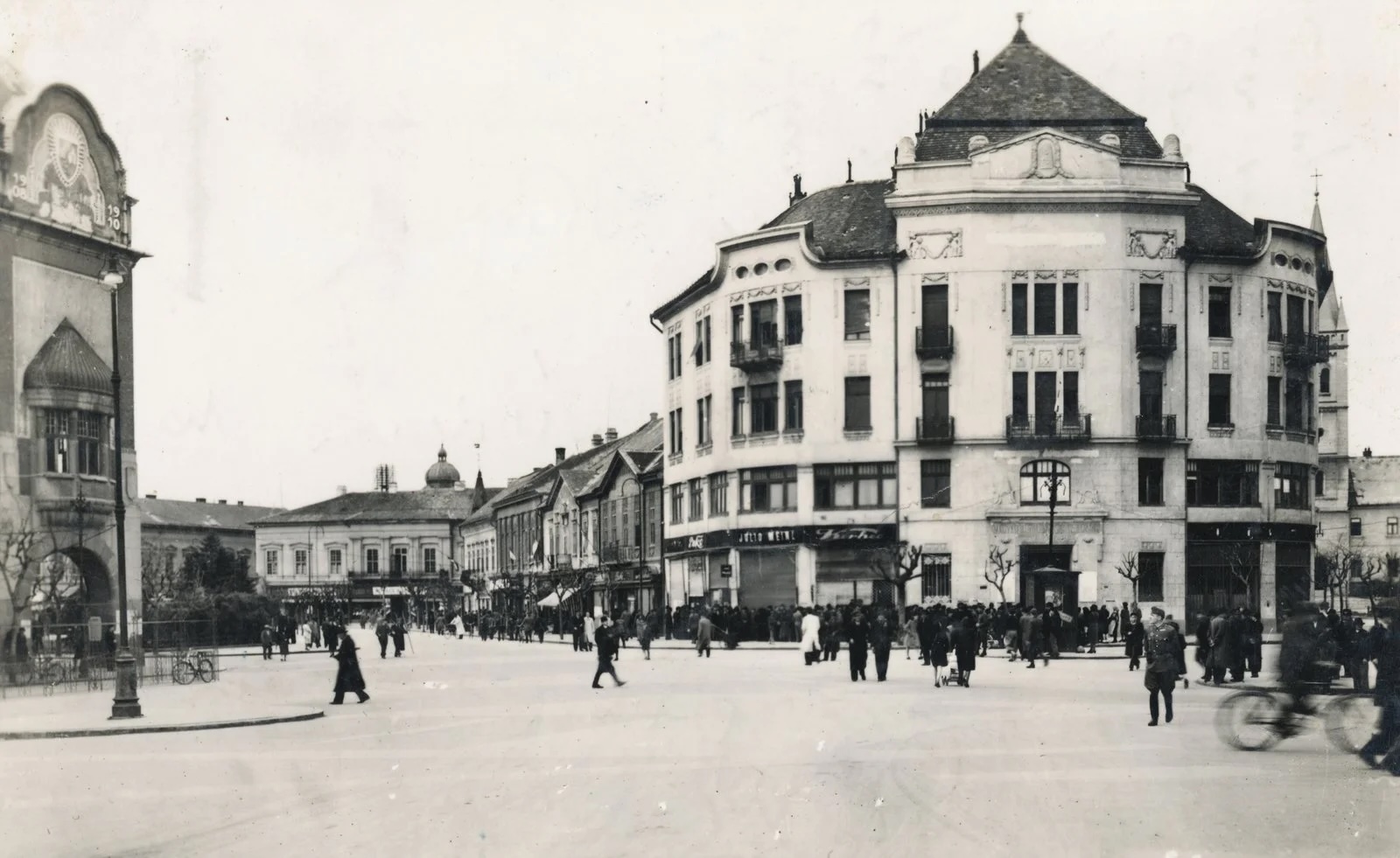 Dominantna zgrada na desnoj strani slike, sa svojim prepoznatljivim krovom i fasadom u stilu secesije, predstavlja jednu od značajnijih građevina u centru Subotice. U prizemlju se mogu videti prodavnice i lokali, koji su nekada bili srce trgovinskog života ovog dela grada. Trg je bio mesto susreta, šetnji i poslovnih aktivnosti, dok su biciklisti, pešaci i prolaznici doprinosili njegovom živopisnom karakteru.