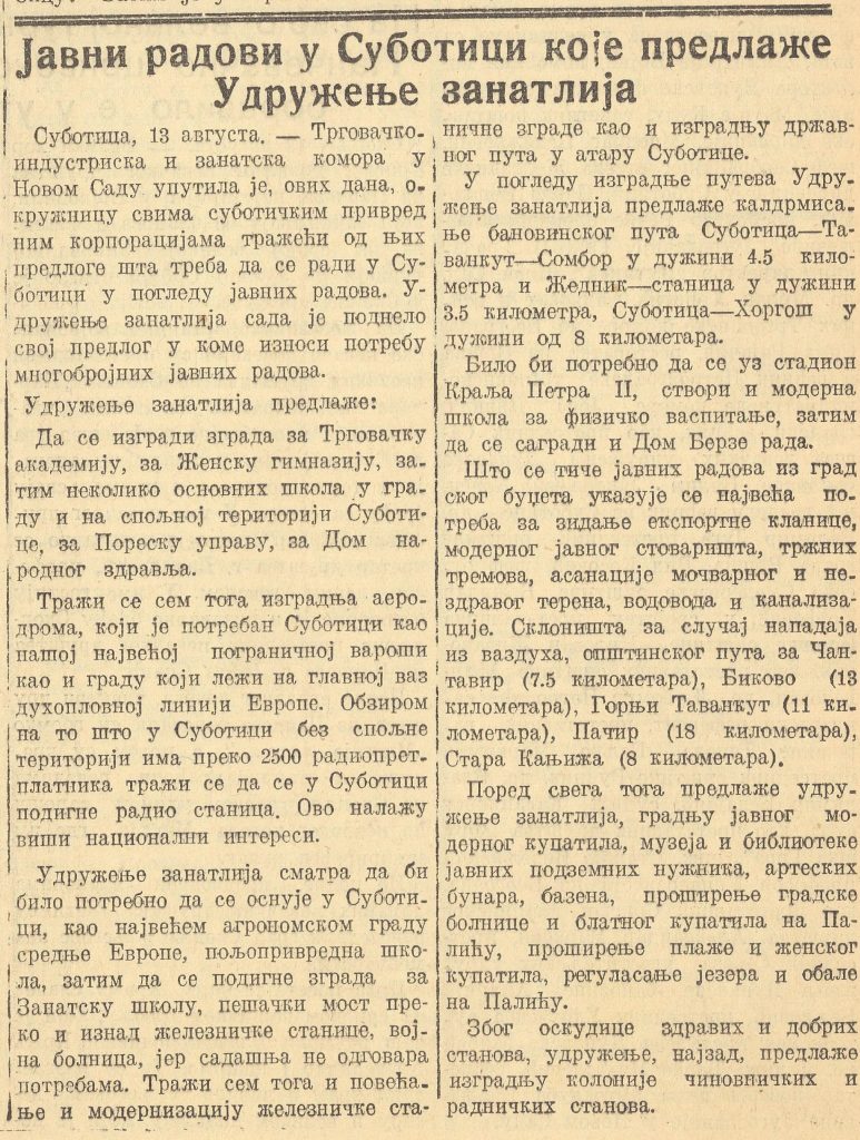 Godine 1936. Udruženje zanatlija Subotice dalo je niz ambicioznih predloga za unapređenje grada, oslikavajući njihovu viziju razvoja i modernizacije. Njihove ideje bile su usmerene na poboljšanje infrastrukture, obrazovanja i kvaliteta života građana.