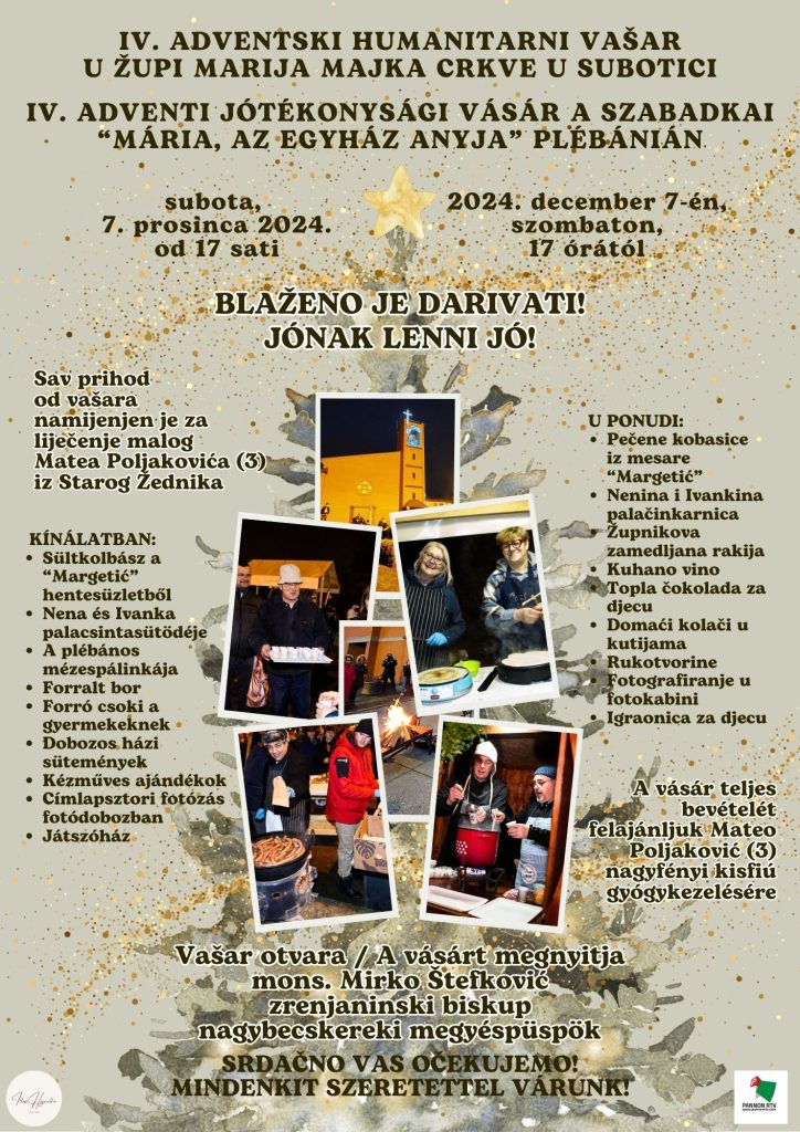 U subotu, 7. decembra 2024. sa početkom od 17 sati,održaće se 4. adventski humanitarni vašar u župi Marija Majka Crkve u Subotici. BLAŽENO JE DARIVATI!