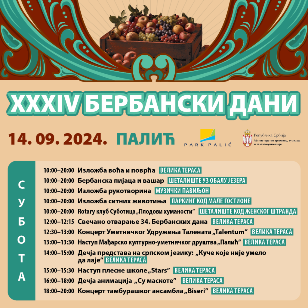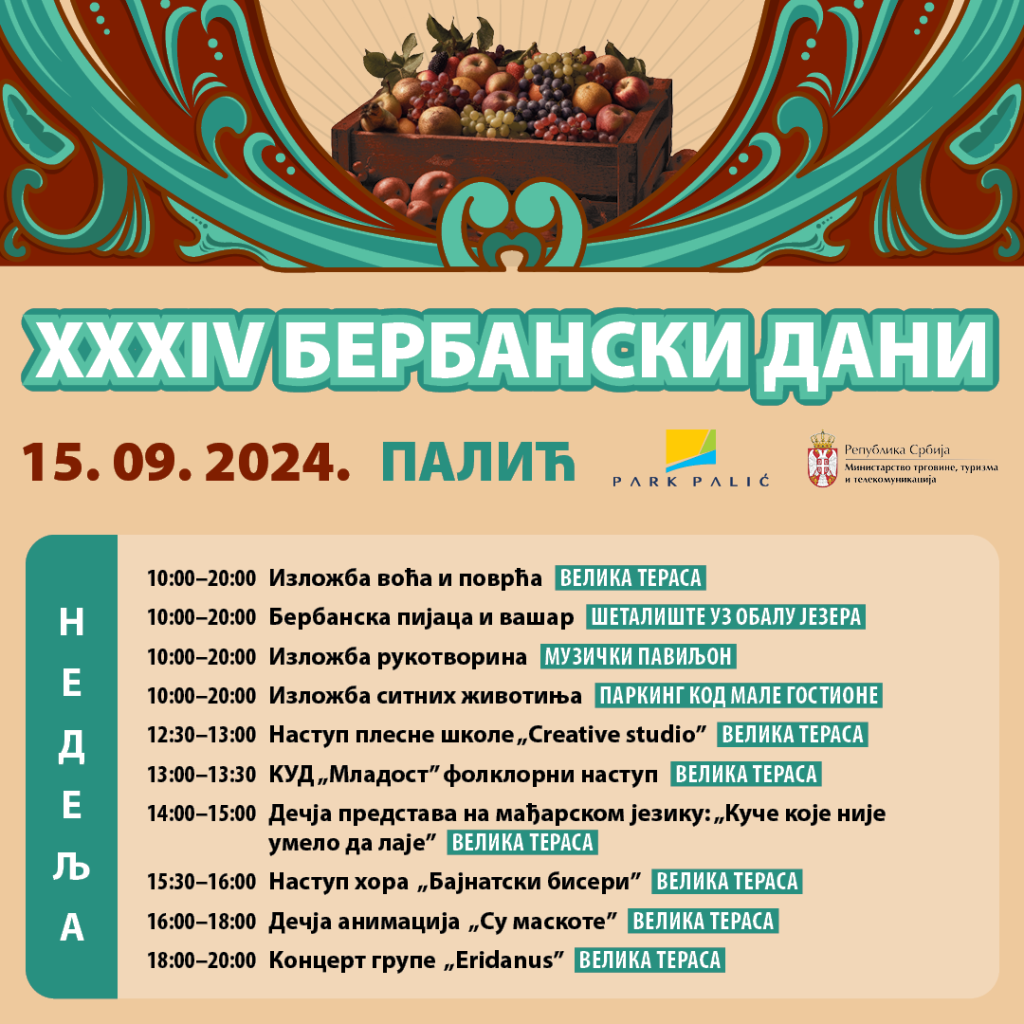 ManifestacijaBerbanski dani se održava na Velikoj terasi, u parku ispred nje i na šetalištu uz obalu Palićkog jezera. Goste očekuju brojni izlagači. Tradicionalna manifestacija koja na Paliću već više od 30 godina okuplja proizvođače vina i vinove loze, poljoprivrednike i voćare, ali i zanatlije i ljubitelje domaćih proizvoda.