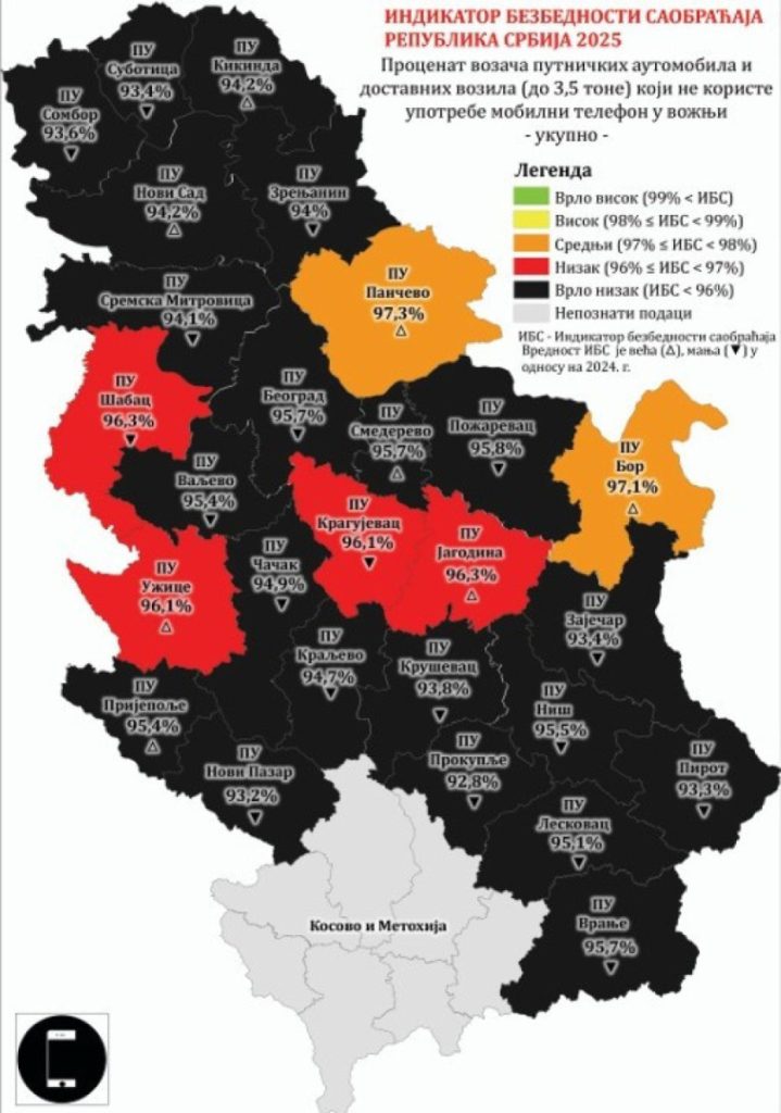Kako je navedeno u Istraživanju indikatora performansi bezbednosti saobraćaja u Republici Srbiji za 2025. godinu, najveća upotreba sigurnosnog pojasa zabeležena je na auto-putu, dok je u odnosu na tu vrednost za oko pet odsto manja upotreba pojasa na putevima van naselja, a u naselju je niža za oko deset odsto.