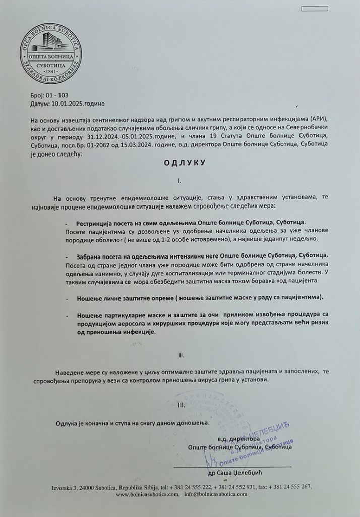 Na osnovu trenutne epidemiološke situacije i izveštaja o akutnim respiratornim infekcijama i gripu na području Severnobačkog okruga, Opšta bolnica Subotica donela je odluku o sprovođenju strožih mera kako bi se smanjio rizik od širenja infekcija.