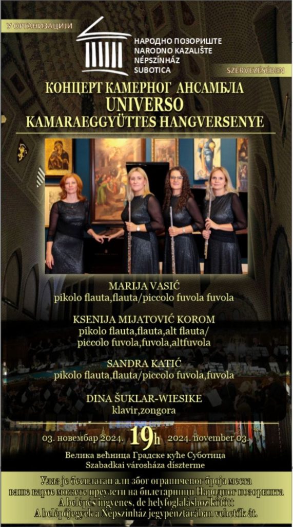 U sklopu koncertnih aktivnosti pod okriljem Narodnog pozorišta, u nedelju 3. novembra od 19 h, u Velikoj većnici Gradske kuće, nastupiće Kamerni ansambl Universo. Ovaj sastav čine tri flautistkinje Marija Vasić (pikolo flauta, flauta), Ksenija Mijatović – Korom (pikolo flauta, flauta, alt flauta), Sandra Katić (pikolo flauta, flauta) i pijanistkinja Dina Šuklar – Wiesike. Ansambl Universo izrastao je iz dugogodišnje profesionalne saradnje i prijateljstva članica sastava. Ideja vodilja u kreiranju programa za ovaj koncert bila je da publici predstave različite instrumente iz porodice flauta upotpunjene klavirskim zvukom. Njihova želja je bila da istaknu mogućnosti upotrebe i specifičnosti boje zvuka pikolo flaute i alt flaute u kamernim ansamblima različitih kombinacija. Zato koncertni program čine atraktivne kompozicije autora XX i XXI veka, a dela su odabrana tako da jedna drugima kontrastiraju kombinacijama zastupljenih instrumenata i sveukupnim muzičkim jezikom. Dakle, na programu su Moyse, Hart, Casterede, Beeftink, Rozman… Ulaznice za koncert kamernog sastava Universo su besplatne,ali zbog ograničenog broja mesta možete ih rezervisati i podići na biletarnici Scene Jadran.