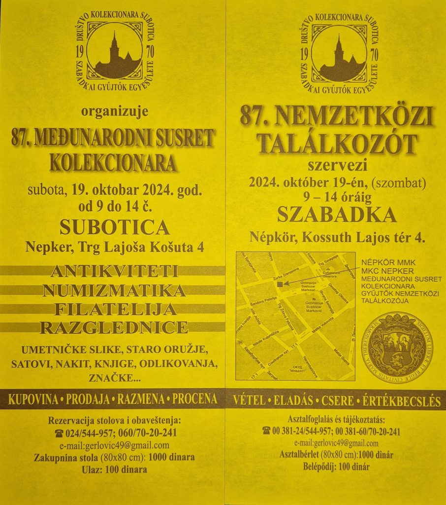 U subotu, 19. oktobra,od 9-14 časova, u Nepkeru, u organizaciji Društva kolekcionara Subotica, održaće se 87. Međunarodni susret kolekcionara.