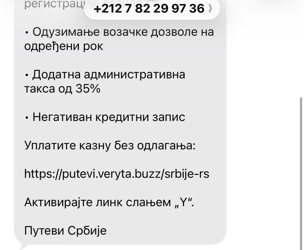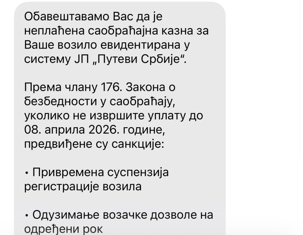 Na mobilne telefone građana širom zemlje počele su da stižu lažne SMS poruke koje potpisuje navodno preduzeće JP „Putevi Srbije“. U porukama se korisnici obaveštavaju o navodnim „neplaćenim saobraćajnim kaznama“ i preti im se drakonskim sankcijama ukoliko ne uplate novac u roku od dva dana.