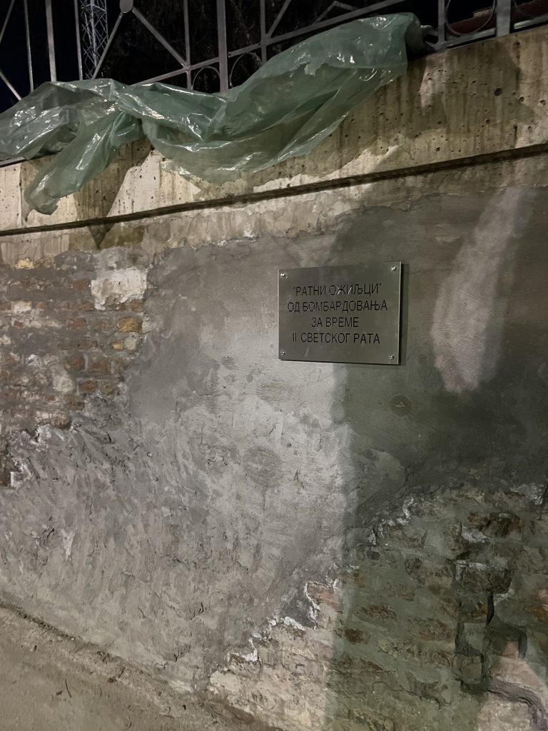 Ovaj zid nosi vidljive tragove bombardovanja iz perioda Drugog svetskog rata, svedočeći o teškim trenucima kroz koje je grad prošao. Ožiljci sačuvani na fasadi predstavljaju tihi podsetnik na razaranja, ali i na otpornost i snagu ljudi koji su grad obnavljali nakon ratnih razaranja.